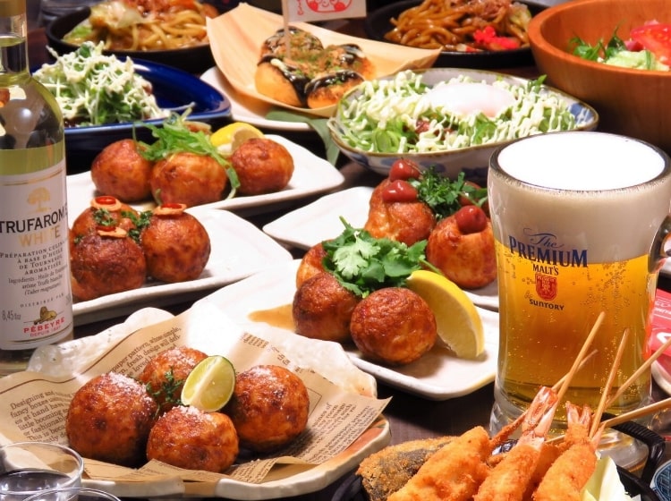 名物のたこ焼きを心ゆくまで楽しめる食べ放題に、串かつと充実のドリンク飲み放題が付いたお得なコース。2名様から利用でき、仲間との宴会や飲み会にぴったりです。