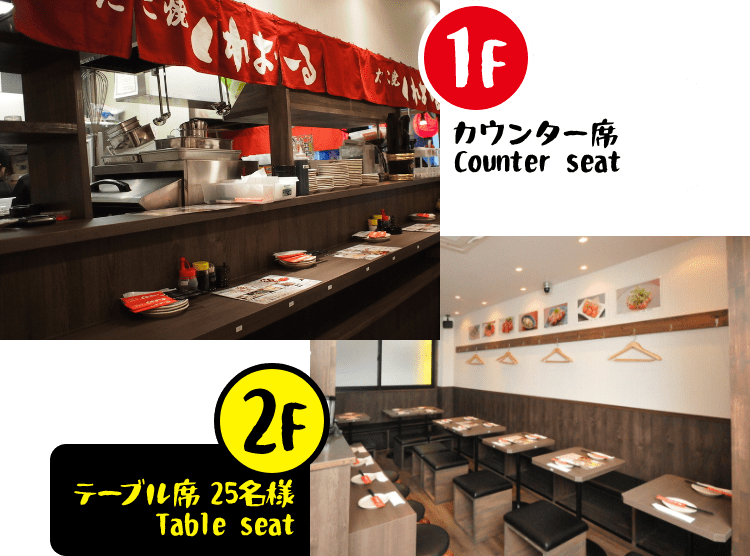 おひとり様でも気軽に立ち寄れる1Fカウンター席と、グループ利用に便利な2Fテーブル席をご用意。少人数から団体まで、シーンに合わせてご利用いただけます。
