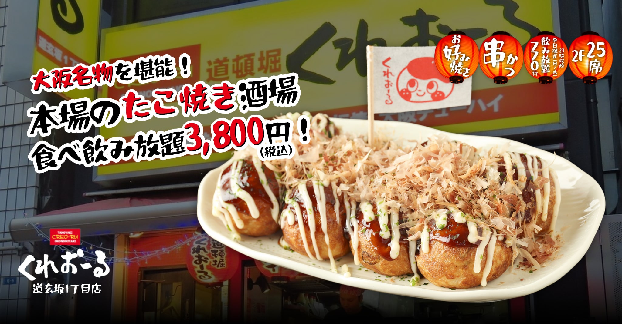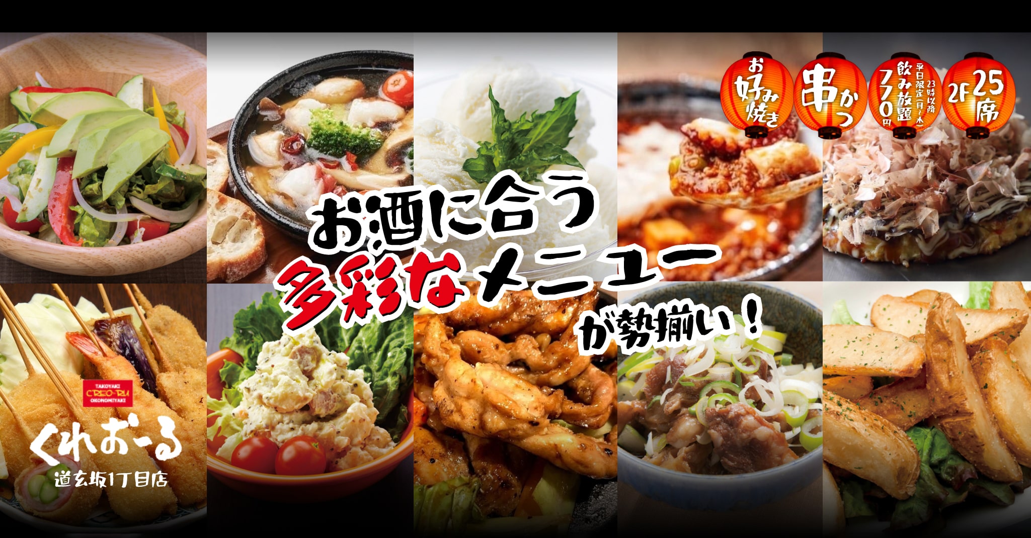 渋谷にある「くれおーる 道玄坂1丁目店」では、大阪・道頓堀で行列が絶えない人気のたこ焼きが気軽に楽しめます。たこ焼きだけでなく大阪名物お好み焼や串かつなど、お酒にあう様々な料理をご用意!23:00以降はなんと770円で飲み放題!気の合う仲間とワイワイ盛り上がれるお店です。
