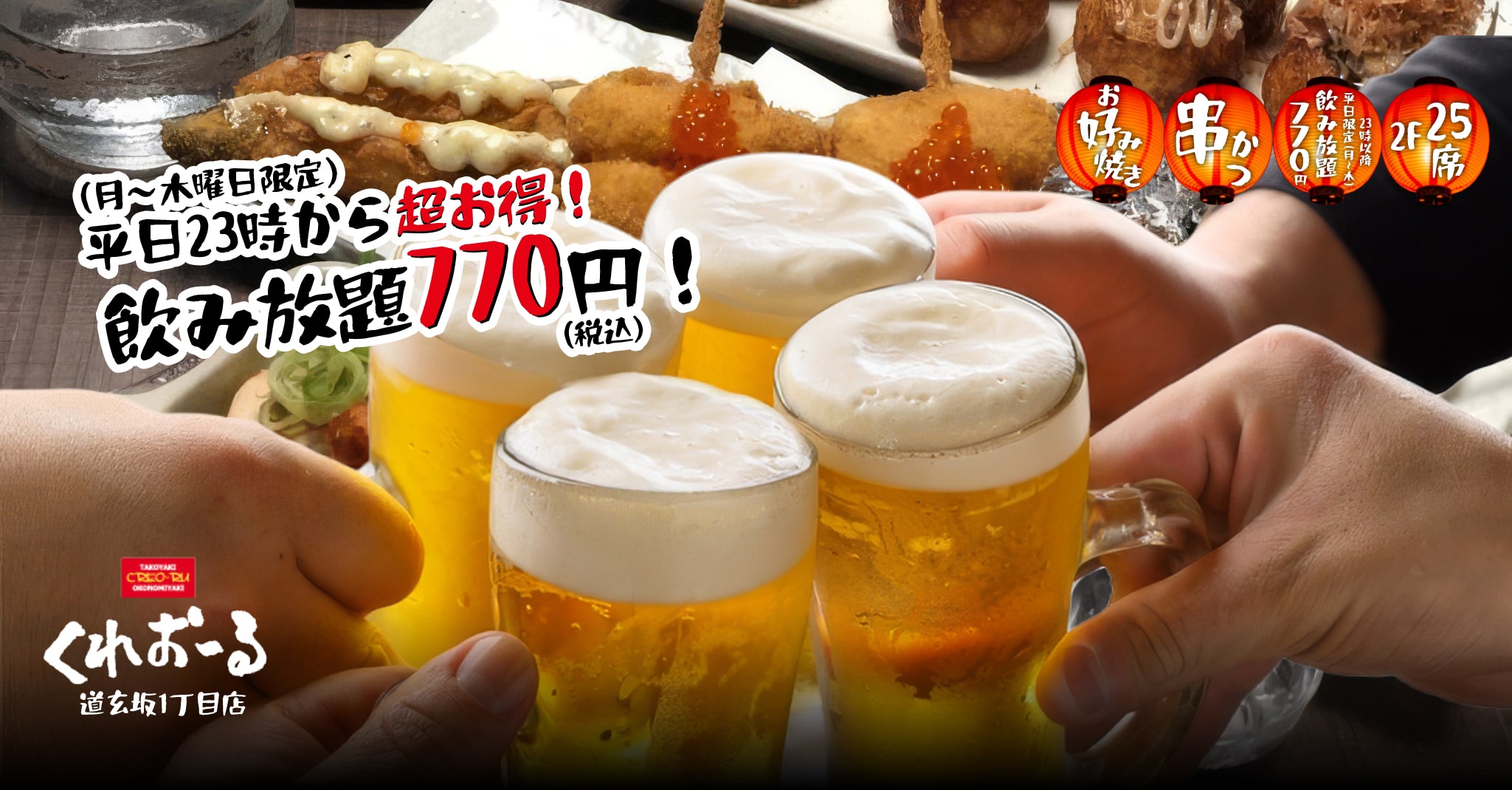 渋谷で深夜にお得に飲むなら当店へ!平日限定(月〜木)の23時からは、ビールを含む1時間飲み放題がなんと770円(税込)!たこ焼きや串かつと一緒に、気軽に楽しんでいただけます。※おひとり様につき1フードのご注文をお願いいたします。