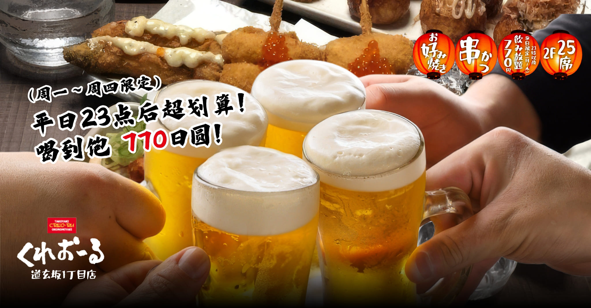 如果想在渋谷深夜划算地喝一杯,就来我们店吧!平日限定(周一~周四)23点起,含啤酒在内的1小时喝到饱只要770日圆(含税)!可搭配章鱼烧或串炸轻松享用。 ※每位顾客需点一份餐点。
